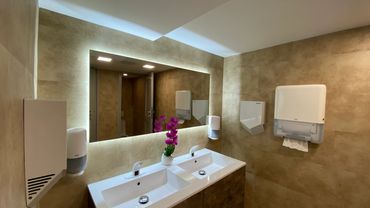 Das Büro verfügt über einen abschließbaren Umkleideraum, eine separate Dusche und eine Toilette, außerdem befinden sich hier die Monitore des Kamerasystems. Das Büro dient auch als Backstage-Bereich und hat einen separaten Eingang von der Kele-Straße. Der großzügige private Parkplatz liegt direkt neben dem Gebäude und kann mit einer Karte geöffnet werden.